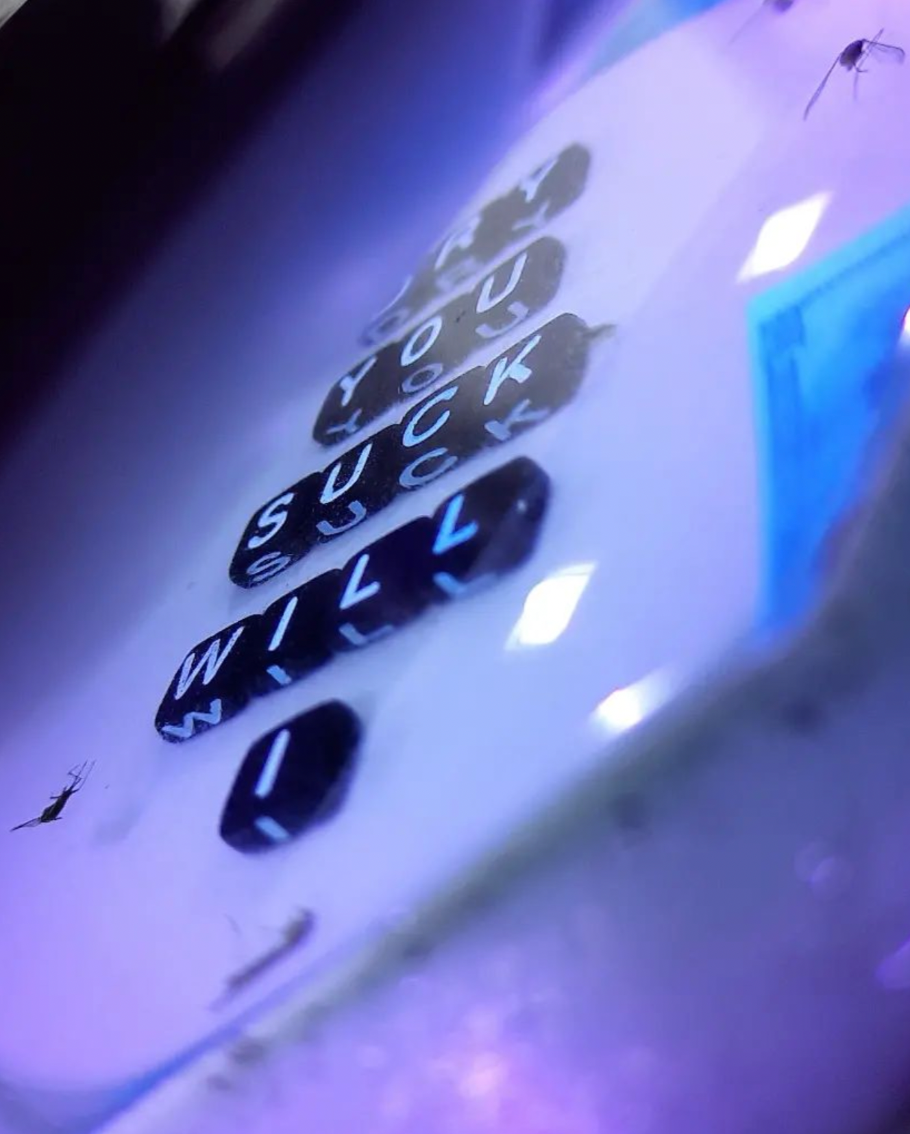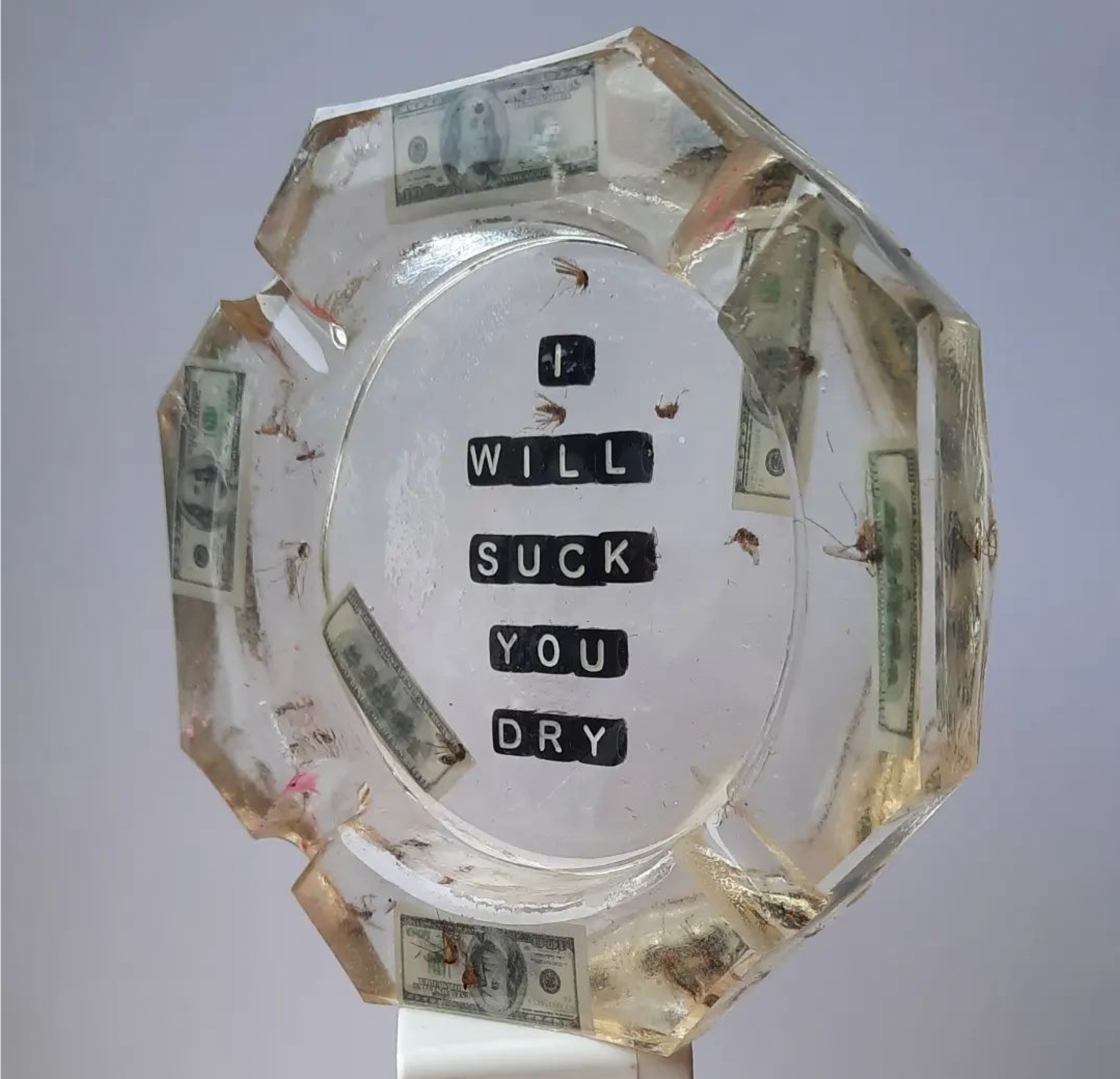 EPOXY WITHÂ LETTERING, MINIATURE DOLLAR BILLS AND MOSQUITOS FROM THE SUMMER OF 2021.